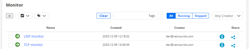 This screen displays all defined monitors. Here, too, a filter is provided for locating a specific monitor. To set up a new monitor, click the Monitoring button on the left-side bar and select New Monitor. Go to this page for full instructions on how to build monitors.