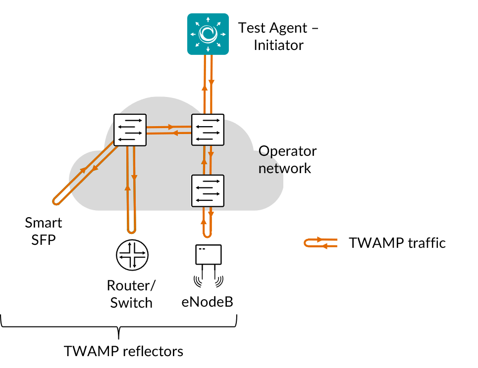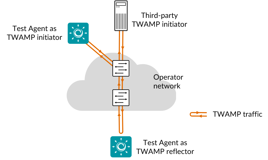 When used for TWAMP testing the Test Agent is typically placed in the core part of the network, or in the data center, and initiates UDP flows towards TWAMP-capable routers or other devices. These reflect the flows back to the Test Agent, which collects measurements and calculates various network KPIs.