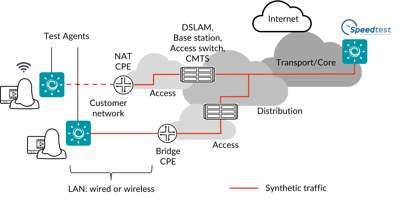 The main differences between Speedtest in Routing Active Testing and publicly available tools such as ► bredbandskollen.se or ► speedtest.net lie in where the servers are located and what you can do in addition to a Speedtest in order to spot and locate problems. One main advantage with Speedtest is that your customers can measure broadband speed in a controlled environment. This is illustrated in the picture below: