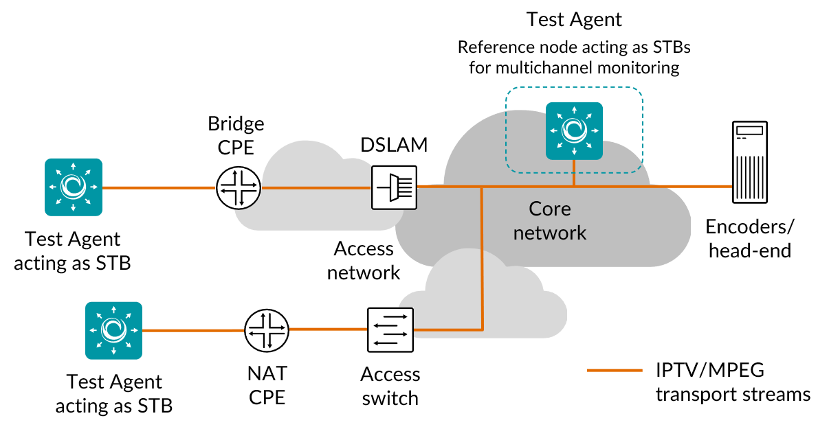 Routing Active Testing Test Agents are equipped with IPTV receivers that perform multichannel measurements at multiple locations inside your network. This makes it possible to visualize your IPTV quality from the head-end all the way to your customers. In this way, you can pinpoint where problems occur and take appropriate actions.