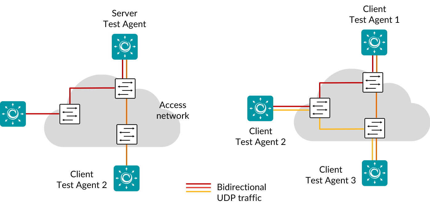 The pictures show hub-and spoke (left) or full-mesh (right) UDP traffic generation between two or more Test Agents for measuring link performance: