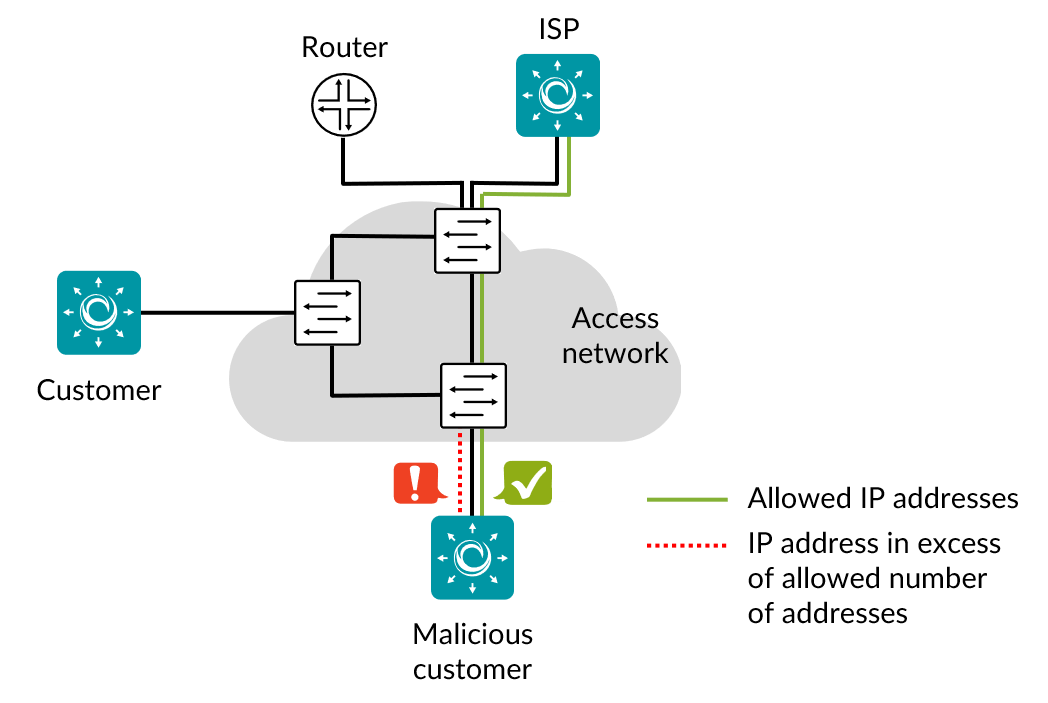 DHCP starvation is an attack that works by broadcasting vast numbers of DHCP requests with spoofed MAC addresses simultaneously, exhausting the DHCP server IP pool. This task checks that a customer can only obtain a limited number of IPv4 addresses, so that DHCP starvation is prevented. Customer takes the allowed number of addresses, then verifies that it cannot get one more.