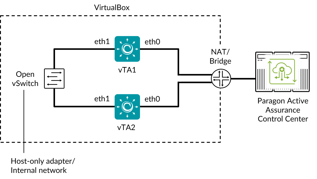 The vTA has another network adapter (labeled “eth1” in the diagram) attached to a VirtualBox host-only Ethernet adapter. This connection is used for communication between vTAs in the course of testing. How to configure this is covered here and here.